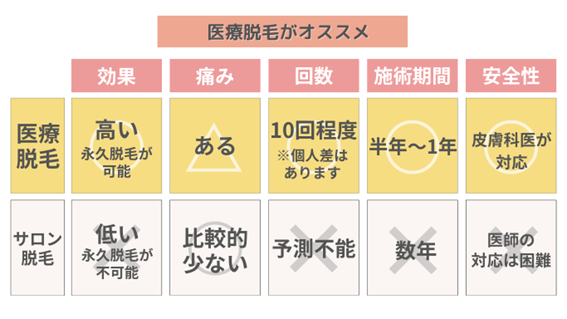 一方、サロン脱毛で使用される光脱毛機器は出力が制限されているため、一時的な減毛効果にとどまり、15〜20回以上の施術が必要となるケースが多いのが現状です。